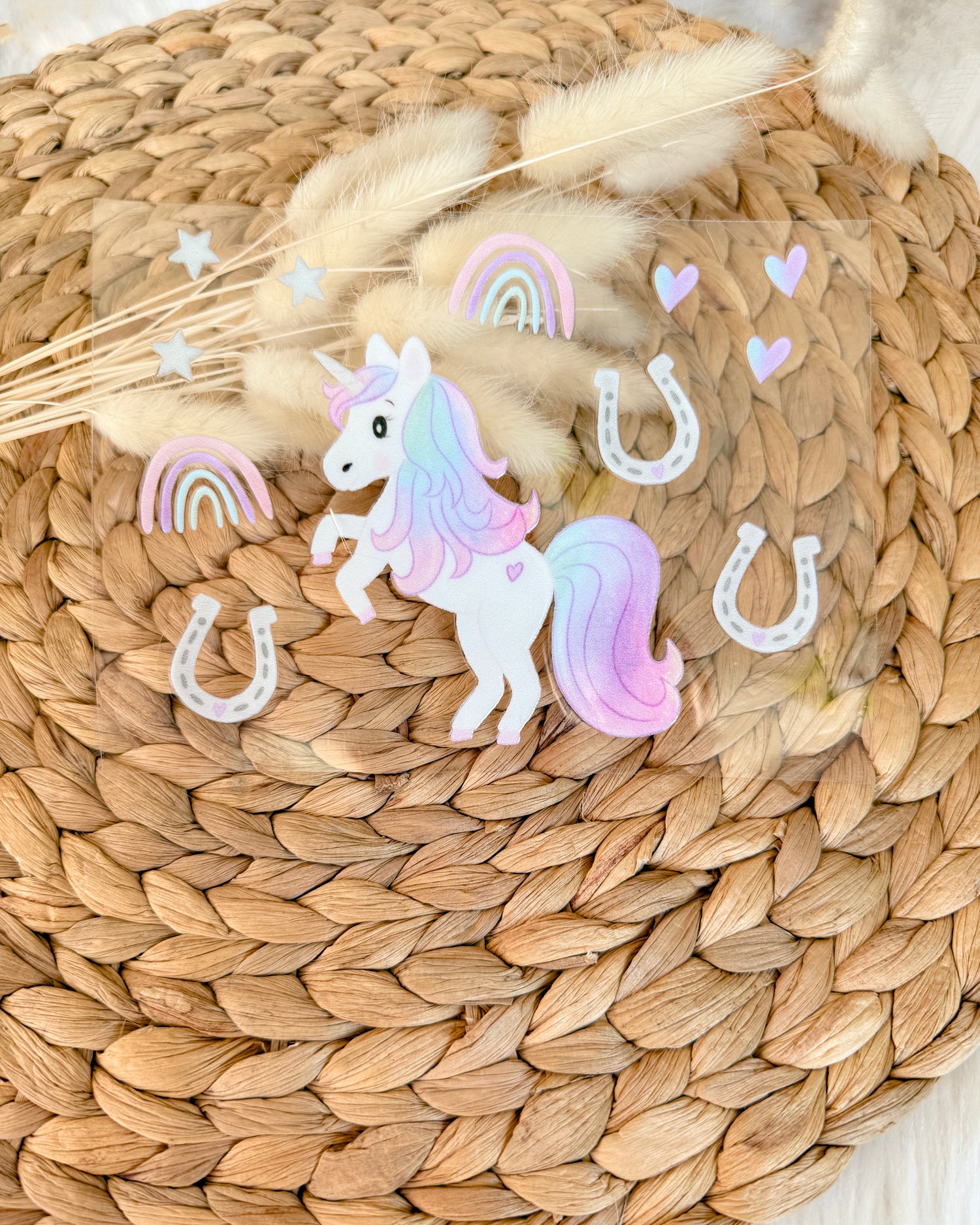 - Einhorn (ca. 8 cm) + passende kleine Elemente (Sterne, Regenbogen etc.)