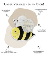 Wenn du die Applikation mit Bügelfolie erworben hast, kannst du den Filzrand bei Bedarf vorsichtig zurückschneiden und die Applikation aufbügeln (achte darauf, nicht in die äußere Plüschnaht zu schneiden). Komplett weg wirst du den Rand aber nicht bekommen.