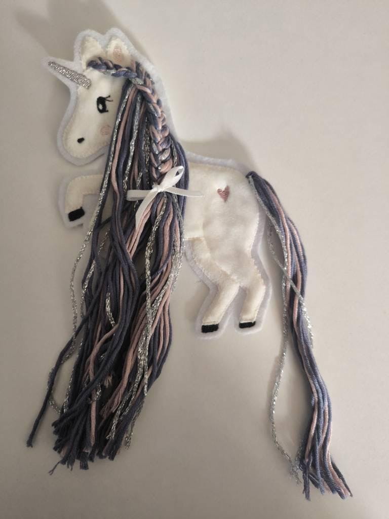 Das kleine, süße Einhorn mit der tollen Mähne in Lila aus Wolle, freut sich auf einen großartigen Platz auf deinem Nähprojekt!