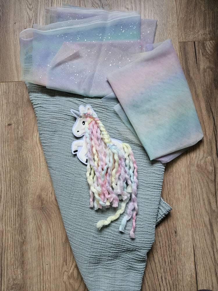Das kleine, süße Einhorn mit der tollen dicken Mähne in Regenbogenfarben, freut sich auf einen großartigen Platz auf deinem Nähprojekt!