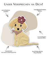 Wenn du die Applikation mit Bügelfolie erworben hast, kannst du den Filzrand bei Bedarf vorsichtig zurückschneiden und die Applikation aufbügeln (achte darauf, nicht in die äußere Plüschnaht zu schneiden). Komplett weg wirst du den Rand aber nicht bekommen.