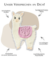 Wenn du die Applikation mit Bügelfolie erworben hast, kannst du den Filzrand bei Bedarf vorsichtig zurückschneiden und die Applikation aufbügeln (achte darauf, nicht in die äußere Plüschnaht zu schneiden). Komplett weg wirst du den Rand aber nicht bekommen.