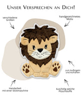 Wenn du die Applikation mit Bügelfolie erworben hast, kannst du den Filzrand bei Bedarf vorsichtig zurückschneiden und die Applikation aufbügeln (achte darauf, nicht in die äußere Plüschnaht zu schneiden). Komplett weg wirst du den Rand aber nicht bekommen.