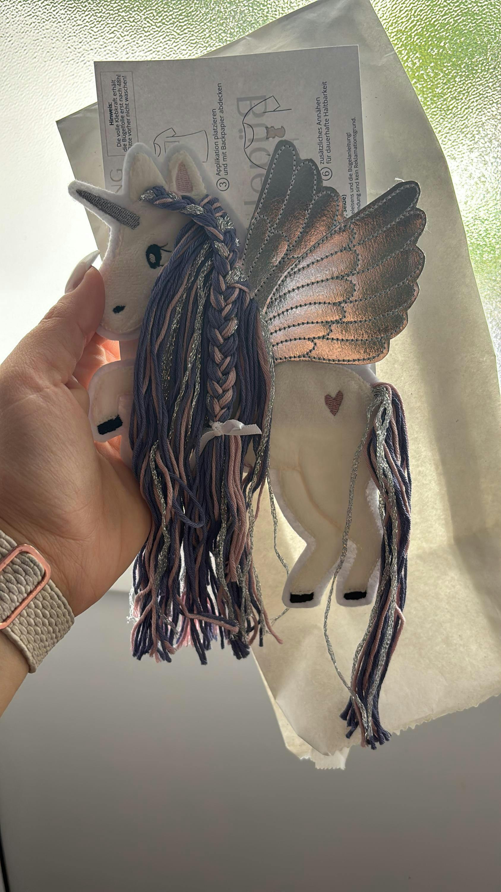 Das kleine, süße Pegasus mit der tollen Mähne in Lila aus Wolle und den großartigen Glitzerflügeln, freut sich auf einen großartigen Platz auf deinem Nähprojekt!