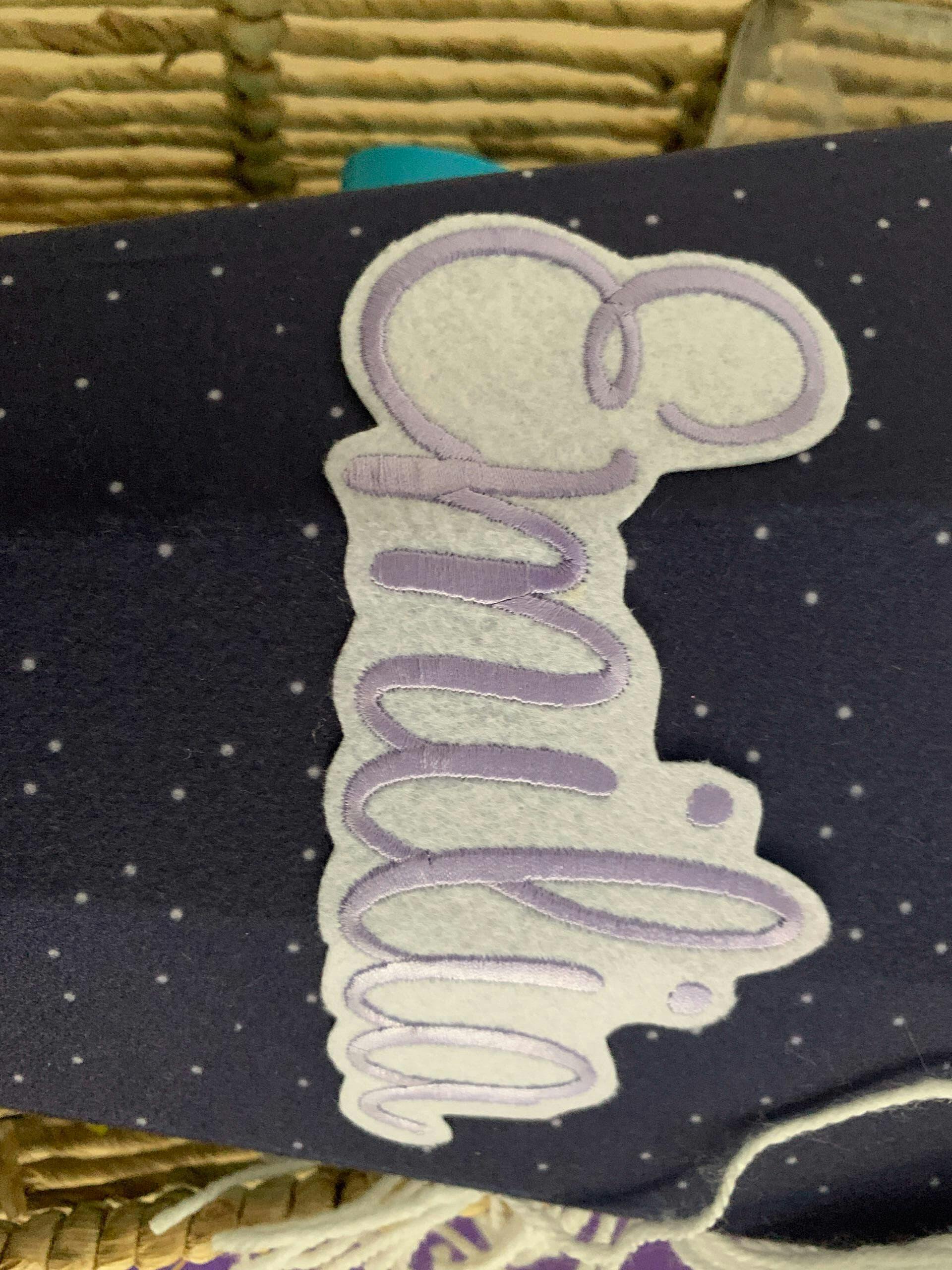 Die Namen werden auf weißes Filz gestickt. Die Stärke des Filzes beträgt 1,5mm, dadurch schmiegt es sich besonders gut bei rundlichen Formen an, beispielsweise an Schultüten.