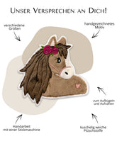 Wenn du die Applikation mit Bügelfolie erworben hast, kannst du den Filzrand bei Bedarf vorsichtig zurückschneiden und die Applikation aufbügeln (achte darauf, nicht in die äußere Plüschnaht zu schneiden). Komplett weg wirst du den Rand aber nicht bekommen.