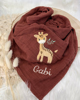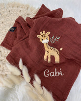 Unser personalisiertes Musselintuch mit der kleinen süßen Giraffe ist eine hervorragende Geschenkidee für Kinder zum Geburtstag oder zur Taufe sowie als Geburtsgeschenk für Babys.