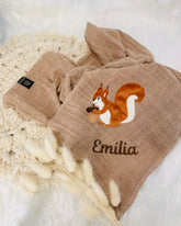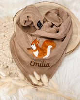 Unser personalisiertes Musselintuch mit dem kleinen süßen Eichhörnchen ist eine hervorragende Geschenkidee für Kinder zum Geburtstag oder zur Taufe sowie als Geburtsgeschenk für Babys.