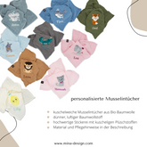 Das Tuch wird von uns mit viel Liebe handgefertigt und ist ein absolutes Unikat. Das Tierchen wird mit kuscheligen Plüschstoffen gestickt, sodass das Tuch auch total toll als Kuscheltuch verwendet werden kann.
