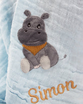 Unser personalisiertes Musselintuch mit dem kleinen süßen Hippo ist eine hervorragende Geschenkidee für Kinder zum Geburtstag oder zur Taufe sowie als Geburtsgeschenk für Babys.