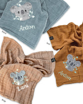 Unser personalisiertes Musselintuch mit dem kleinen Koala ist eine hervorragende Geschenkidee für Kinder zum Geburtstag oder zur Taufe sowie als Geburtsgeschenk für Babys.