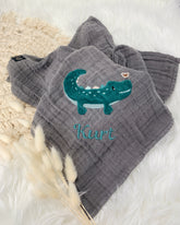 Unser personalisiertes Musselintuch mit dem kleinen niedlichen Krokodil ist eine hervorragende Geschenkidee für Kinder zum Geburtstag oder zur Taufe sowie als Geburtsgeschenk für Babys.